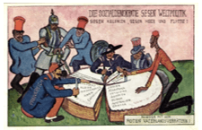 + Trong khi các nước Anh, Mĩ, Italia, Pháp đã cơ bản chia cắt xong, thì đế quốc Đức (Deutschiland) - được miêu tả trong trang phục của một thống chế quân đội, trên tay cầm gươm - đang lao về phía chiếc bánh ngọt “thế giới” với vẻ mặt lộ rõ sự hằn học, hiếu chiến (do phần bánh còn lại khá ít ỏi).
