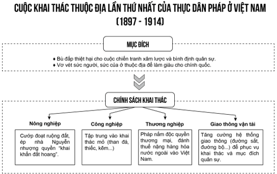 Bài 1 trang 64 SBT Lịch Sử 8: Dựa vào kiến thức đã học, em hãy vẽ sơ đồ thể hiện chính sách khai thác thuộc địa lần thứ nhất (1897 - 1914) của thực dân Pháp ở Việt Nam.