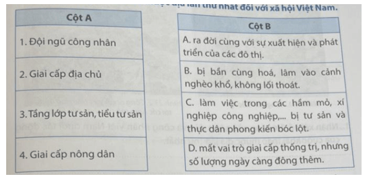 Bài 3 trang 65 SBT Lịch Sử 8: Em hãy nối các dữ liệu ở cột A với các dữ liệu ở cột B cho phù hợp về tác động của cuộc khai thác thuộc địa lần thứ nhất đối với xã hội Việt Nam.