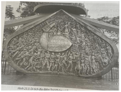 Bài 9 trang 68 SBT Lịch Sử 8: Tháng 4 - 1908, Nguyễn Tất Thành tham gia cuộc biểu tình chống sưu cao thuế nặng tại Huế. Tại vị trí trước đây là Toà Khâm sứ Trung Kỳ - nơi chứng kiến hoạt động yêu nước đầu tiên của Nguyễn Tất Thành vào đầu thế kỉ XX, một bức phù điêu đã được dựng lên để ghi nhớ sự kiện này.