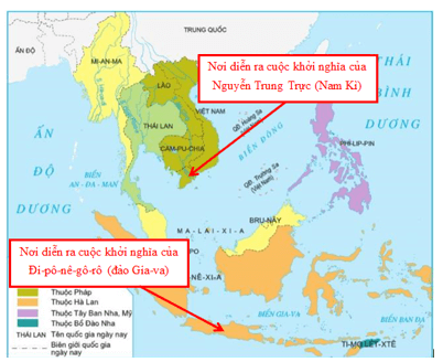 Câu 2 trang 13 SBT Lịch Sử 8: Khoanh tròn trên lược đồ khu vực xảy ra các cuộc khởi nghĩa của Đi-pô-nê-gô-rô và Nguyễn Trung Trực bằng hai màu khác nhau.