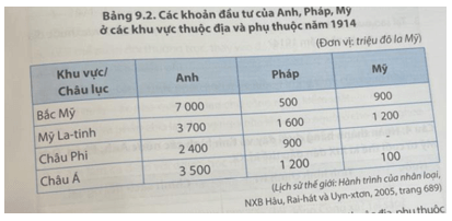 Câu 1 trang 33 SBT Lịch Sử 8: Tính tỉ lệ các khoản đầu tư của Anh, Pháp, Mỹ ở các khu vực thuộc địa, phụ thuộc và điền số liệu vào bảng 9.3 bên dưới.