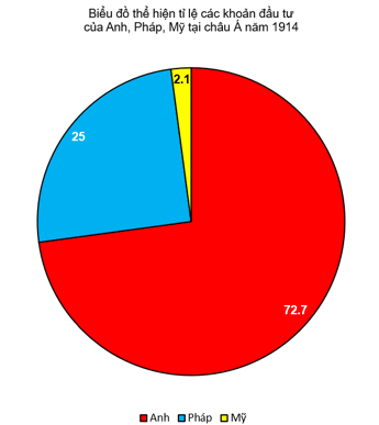Câu 2 trang 33 SBT Lịch Sử 8: Vẽ biểu đồ thể hiện tỉ lệ các khoản đầu tư của Anh, Pháp, Mỹ tại châu Á năm 1914.