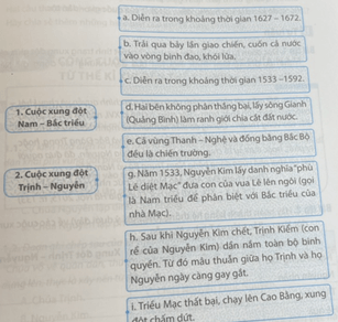 Bài tập 2 trang 25 SBT Lịch Sử 8: Hãy ghép ô thông tin ở bên trái với ô bên phải sao cho phù hợp với nguyên nhân, hệ quả của các cuộc xung đột Nam - Bắc triều và Trịnh - Nguyễn.