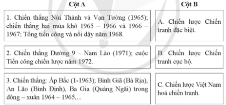 Câu 16. Ghép tên những thắng lợi tiêu biểu trên mặt trận quân sự của quân dân miền Nam ở cột A với tên chiến lược chiến tranh thực dân mới của Mỹ ở cột B sao cho đúng.