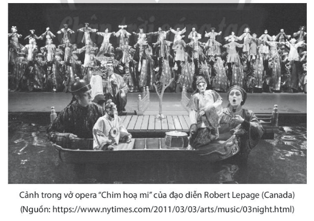 Câu 10 trang 57 SBT Ngữ Văn lớp 10 Tập 1: Dưới đây là một cảnh trong vở opera Chim họa mi của đạo diễn Robert Lepage (Canada) mà tác giả bài báo đã đề cập. Đạo diễn Lepage đã nói rằng vở diễn này được gợi cảm hứng chính từ nghệ thuật rối nước truyền thống của Việt Nam.