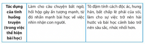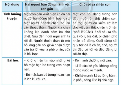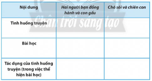 c. Dựa vào bảng sau, xác định tình huống truyện, bài học, tác dụng của tình huống trong việc thể hiện bài học trong các truyện Hai người bạn đồng hành và con gấu, Chó sói và chó con