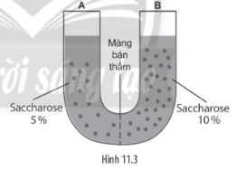 - Giải thích: Màng bán thấm cho nước đi qua nhưng không cho saccharose đi qua. Mà ống A có nồng độ saccharose thấp hơn ở ống B nên nước di chuyển qua màng bán thấm từ ống A sang ống B làm cho mực nước ở ống B dâng lên, còn saccharose không di chuyển qua màng.