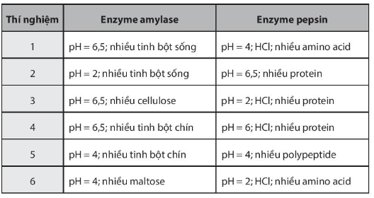 Enzyme amylase hoạt động thủy phân tinh bột chín trong môi trường pH = 6,5; còn enzyme pepsin thủy phân protein ở môi trường pH = 2. Do đó: