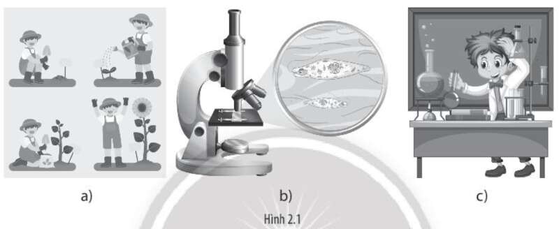 Bài 2.1 trang 8 sách bài tập Sinh học 10: Em hãy cho biết các hình ảnh sau đây đang mô tả phương pháp nghiên cứu và học tập nào của môn Sinh học.