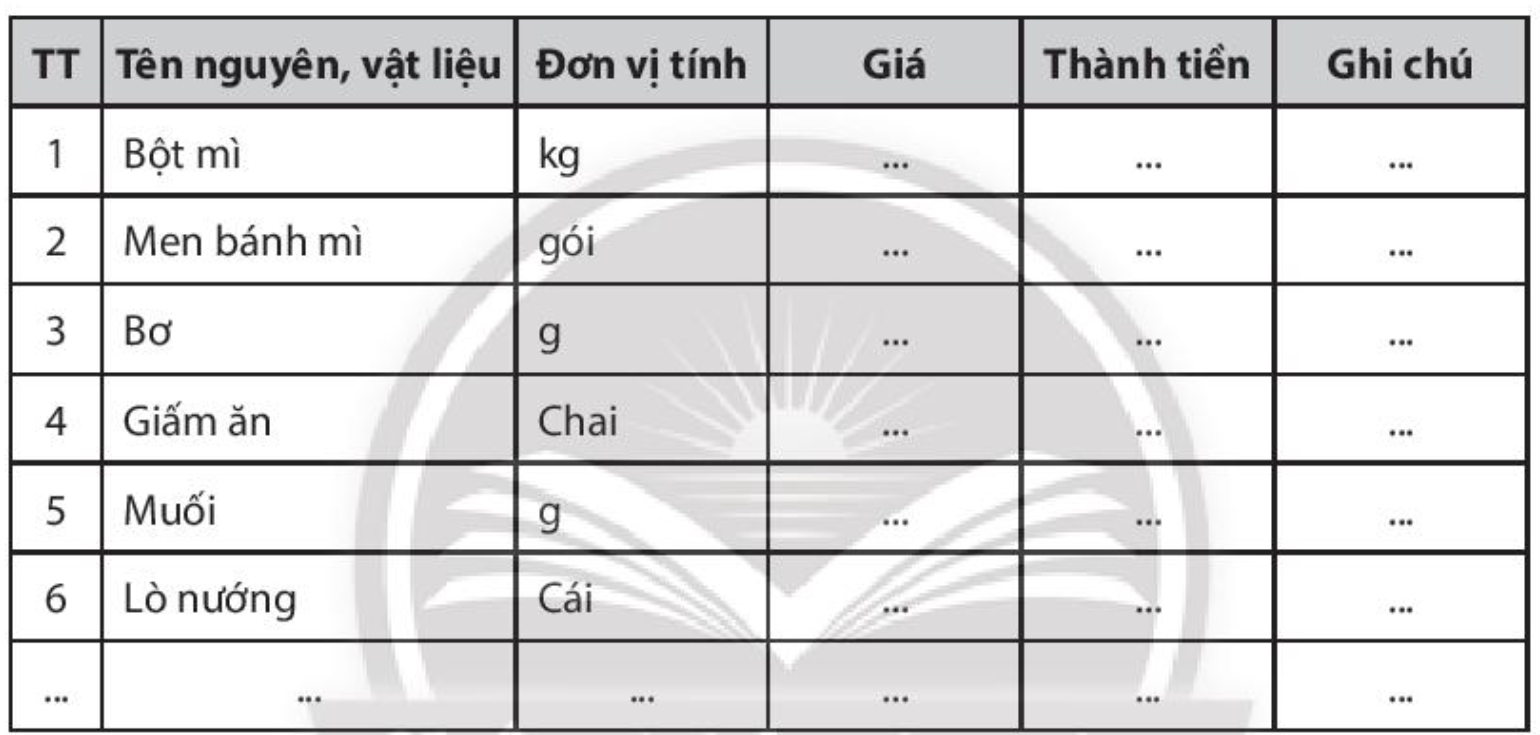 Gợi ý: Học sinh lập bảng dự trù chi phí để xây dựng một lò sản xuất bánh mì với quy mô 500 bánh một ngày theo mẫu như sau: