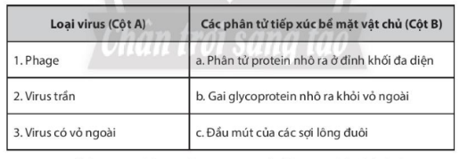 Bài 29.3 trang 89 sách bài tập Sinh học 10: Ghép tên loại virus (Cột A) sao cho phù hợp với các phân tử tiếp xúc bề mặt vật chủ (Cột B).
