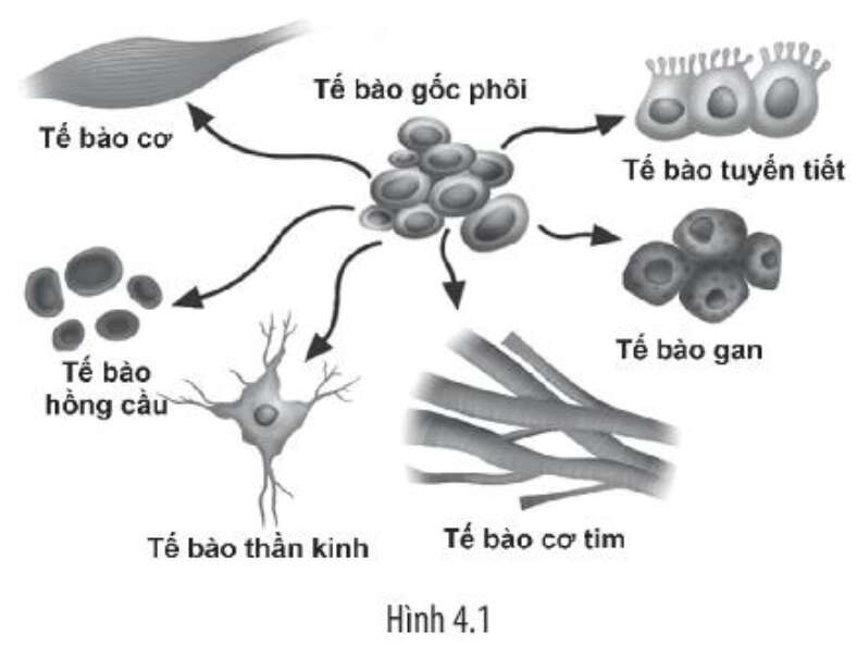 a) Hình 4.1 mô tả quá trình biệt hóa tế bào. Do từ tế bào gốc phôi đã hình thành nên các loại tế bào khác nhau có chức năng nhất định.
