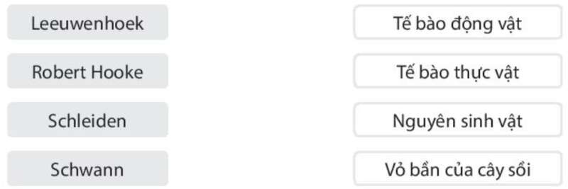 Bài 4.5 trang 14 sách bài tập Sinh học 10: Ghép tên các nhà khoa học cho đúng với đối tượng mà họ đã quan sát được khi nghiên cứu về tế bào.