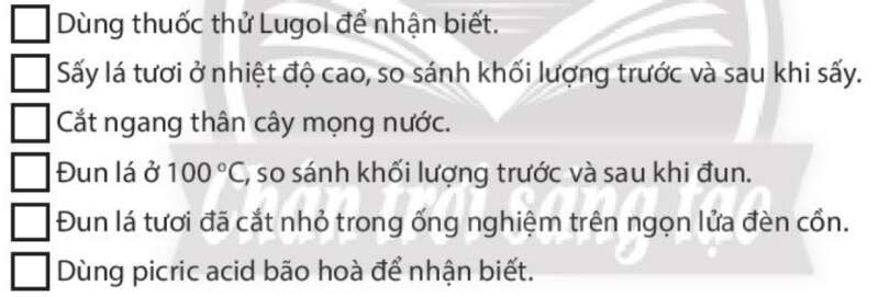 Bài 7.4 trang 22 sách bài tập Sinh học 10: Các cách nào sau đây có thể được dùng để xác định sự có mặt của nước trong tế bào?