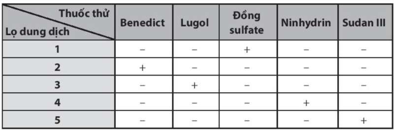 Bài 7.11 trang 23 sách bài tập Sinh học 10: Một bạn học sinh đã quên dán nhãn tên cho năm lọ dung dịch nên gặp khó khăn trong việc cất chúng đúng vị trí. Sau đó, bạn đó đã tiến hành thí nghiệm để xác định tên của mỗi loại dung dịch đó với năm loại thuốc thử khác nhau. Kết quả được bạn ghi nhận ở bảng bên dưới. Biết (+) là kết quả dương tính; (-) là kết quả âm tính.