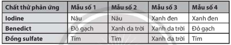 Bài 7.12 trang 24 sách bài tập Sinh học 10: Một mẫu thực phẩm đã bị mất nhãn được cho là có chứa saccharose và protein. Thông qua một số thử nghiệm, người ta đã thu được các kết quả khác nhau. Mẫu thực phẩm nói trên tương ứng với mẫu thí nghiệm nào trong bảng dưới đây? Giải thích?