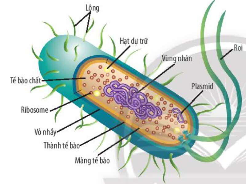 - Tế bào vi khuẩn có các thành phần chủ yếu như: thành tế bào, màng sinh chất, tế bào chất và vùng nhân.