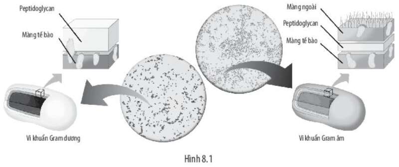 Bài 8.4 trang 26 sách bài tập Sinh học 10: Tùy theo cấu trúc và thành phần hóa học của lớp peptidoglycan, vi khuẩn được chia thành
