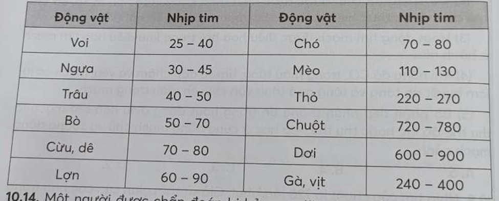 Bài 10.13 trang 36 SBT Sinh học 11: Bảng sau đây cho biết nhịp tim (nhịp/phút) ở một số loài động vật. Hãy nhận xét và giải thích mối quan hệ giữa nhịp tim và kích thước cơ thể của động vật.