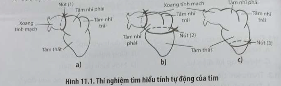 Bài 11.7 trang 38 SBT Sinh học 11: Để chứng minh tính tự động của tim ếch, người ta dùng chỉ thắt ba nút ở các vị trí khác nhau của tim như Hình 11.1.