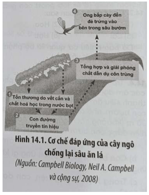 Câu 14.8 trang 48 SBT Sinh học 11: Hình 14.1 cho thấy phản ứng của cây ngô chống lại sâu ăn lá cây. Theo đó, lá ngô tổng hợp và giải phóng vào môi trường chất dẫn dụ ong bắp cày đến đẻ trứng vào bên trong sâu bướm. Ấu trùng sau khi nở ra từ trứng sẽ sử dụng chính sâu làm thức ăn, nhờ đó, sâu bị tiêu diệt.