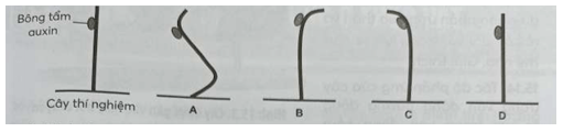 Câu 15.10 trang 50 SBT Sinh học 11: Dùng bông tẩm auxin rồi áp sát vào một bên thân ở phần ngọn cây đã cắt đỉnh sinh trưởng (như hình vẽ sau). Sau 10 ngày, kết quả thu được theo hình nào trong các hình sau?