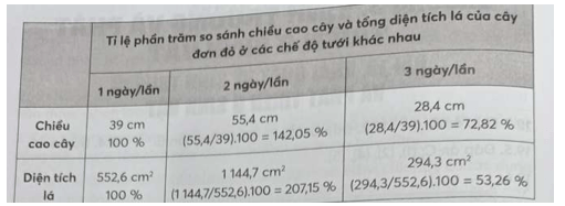 Nếu lấy chiều cao và diện tích lá của lô cây được tưới 1 ngày/lần làm chuẩn thì tỉ lệ phần trăm so sánh về chiều cao cây và tổng diện tích lá của cây đơn đỏ khi tưới 2 ngày/lần và 3 ngày/lần được thể hiện như sau: