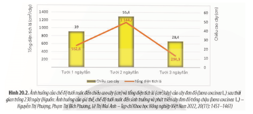 Câu 20.3 trang 71 SBT Sinh học 11: Dựa vào Hình 20.2 (SGK, trang 133), nếu lấy số liệu khi tưới 1 ngày/lần làm chuẩn, hãy tính tỉ lệ phần trăm so sánh về chiều cao cây và tổng diện tích lá của cây đơn đỏ khi tưới 2 ngày/lần và tưới 3 ngày/lần.