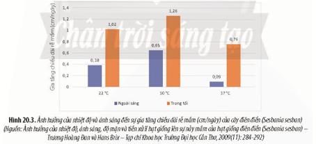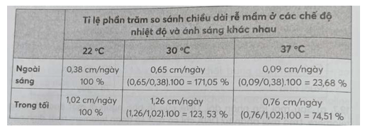 Nếu lấy sự gia tăng rễ mầm ở mức nhiệt độ 22 °C làm chuẩn, tỉ lệ phần trăm so sánh sự gia tăng chiều dài rễ mầm của cây điên điển ở các mức nhiệt độ 30 °C và 37 °C khi để ngoài sáng và trong tối được thể hiện như sau: