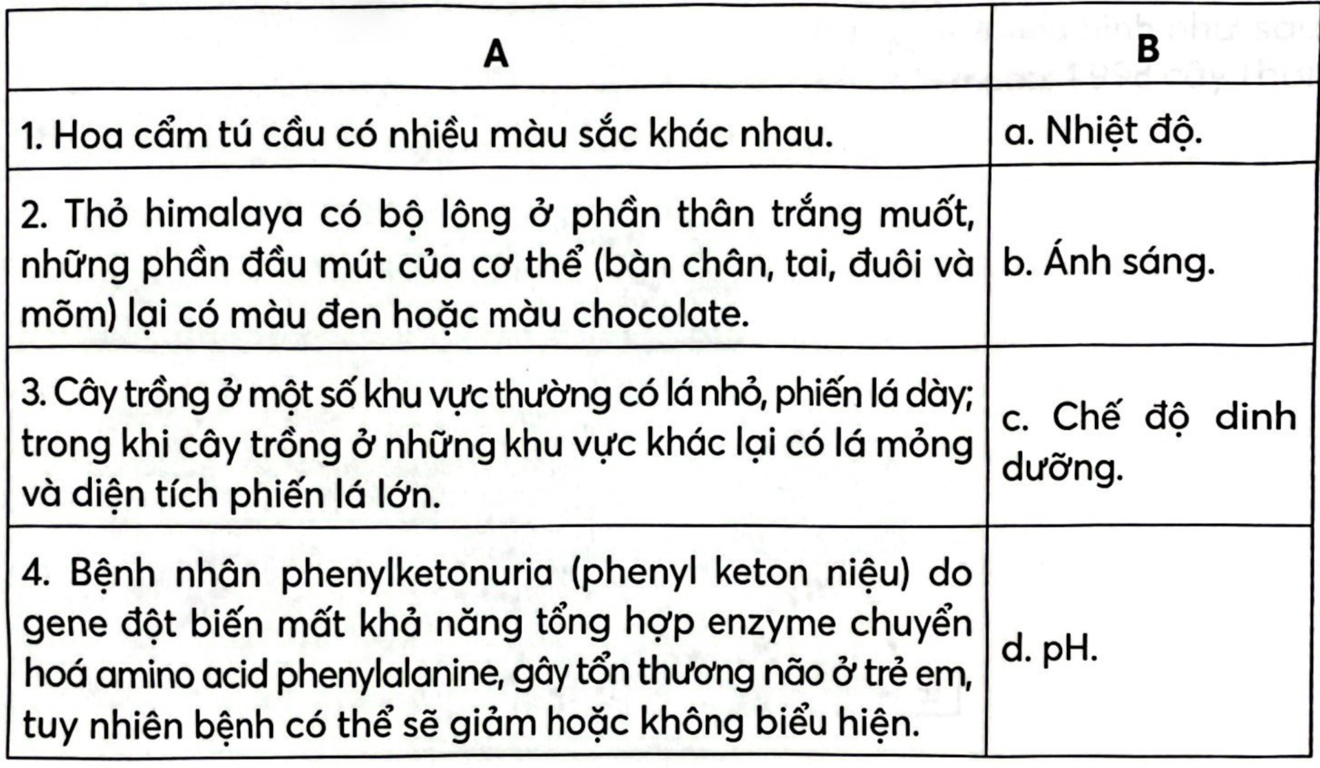 Câu 10.3: Hãy ghép ví dụ về sự thay đổi kiểu hình trong các điều kiện môi trường khác nhau ở cột A với yếu tố môi trường chủ yếu tác động lên kiểu gene ở cột B trong bảng sau.