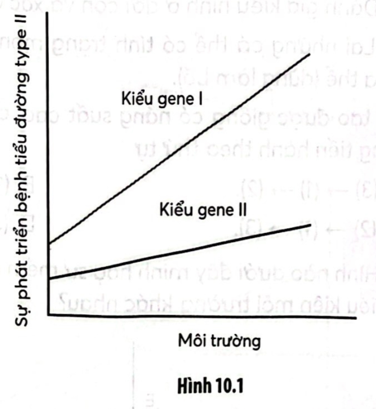 Câu 10.4: Sự phát triển của bệnh tiểu đường type lI ở hai bệnh nhân được theo dõi và ghi lại như biểu đồ ở Hình 10.1. Yếu tố môi trường trong đồ thị từ trái sang phải thể hiện chế độ ăn uống ngày càng kém, chế độ hoạt động ngày càng ít hơn và có lối sống tiêu cực như hút thuốc. Phát biểu nào dưới đây đúng về sự phát triển bệnh tiểu đường type I?