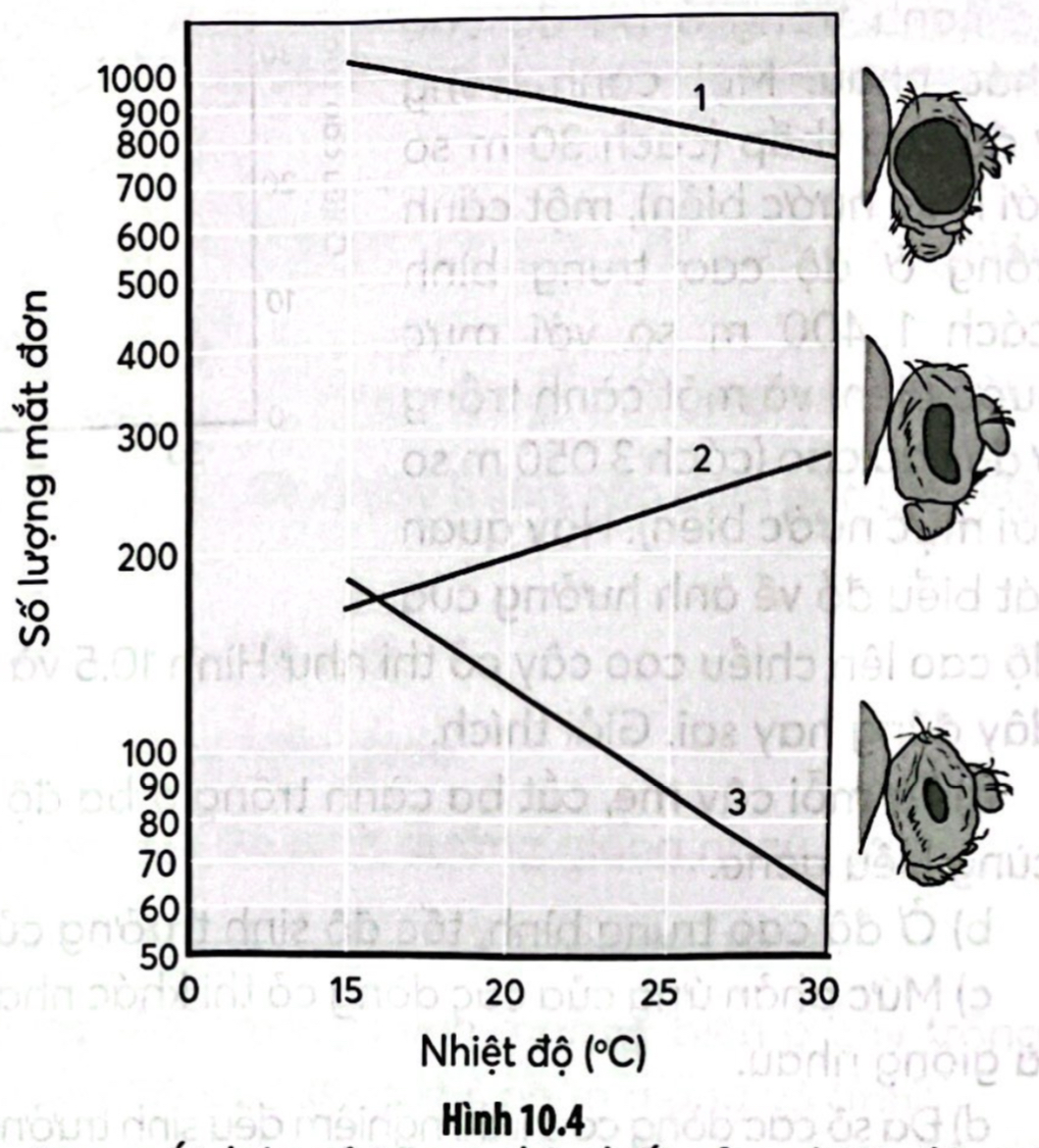 Câu 10.10: Ba dòng ruồi giấm Drosophila melanogaster khác nhau được kí hiệu 1, 2, 3. Hãy quan sát thông tin trong biểu đồ Hình 10.4 và cho biết nhiệt độ môi trường ảnh hưởng như thế nào đến số lượng mắt đơn cấu tạo nên mắt kép của chúng.