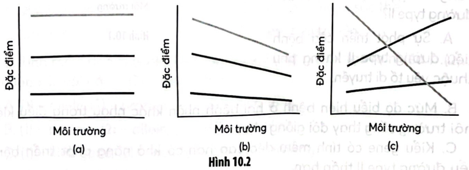 Câu 10.8: Hình nào dưới đây minh hoạ sự mềm dẻo của đặc điểm kiểu hình trong các điều kiện môi trường khác nhau?
