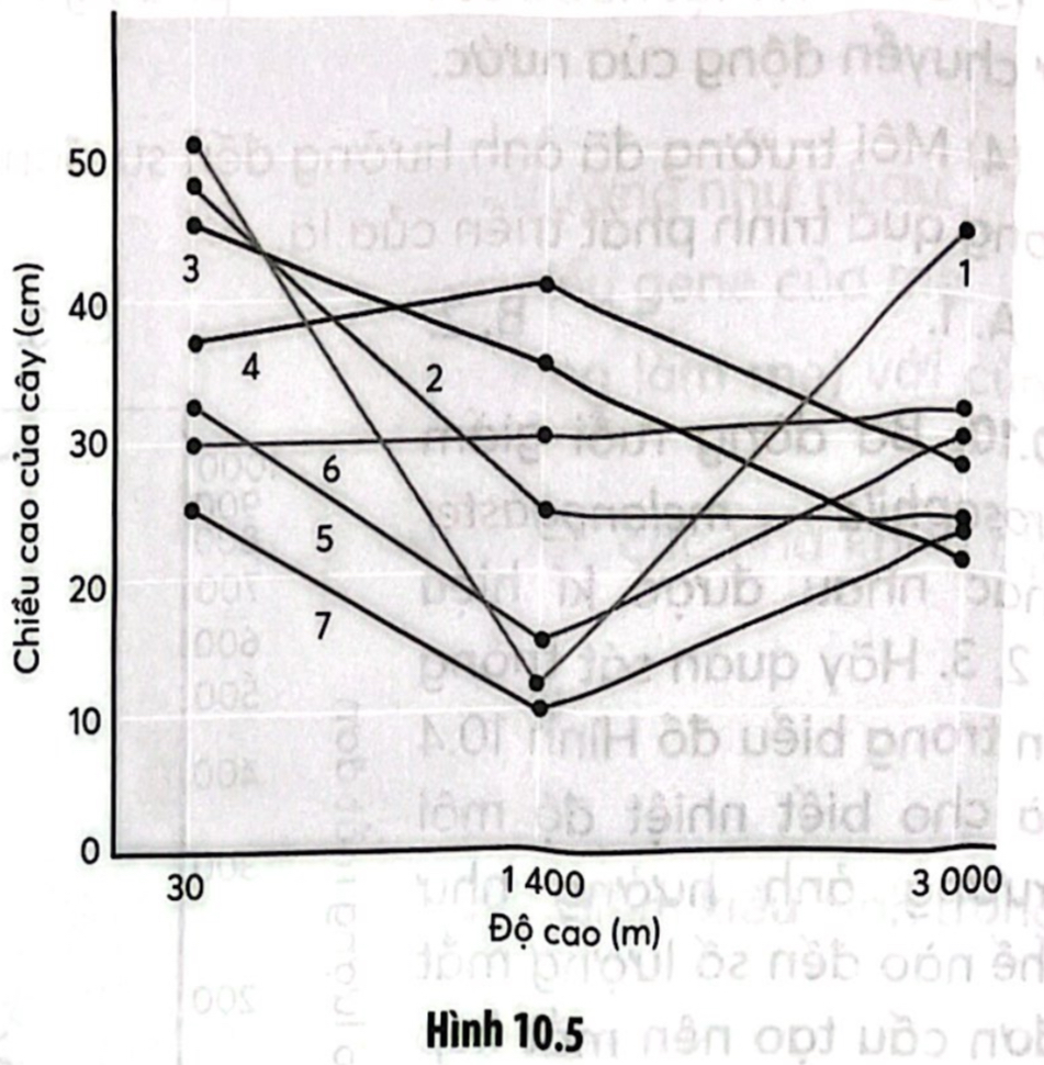Câu 10.12: Khi nghiên cứu về mức phản ứng của cây cỏ thi Achillea millefolium, bảy dòng cây mẹ được trồng (kí hiệu từ 1 đến 7), sau đó từ mỗi dòng mẹ, lấy ba cành trồng ở ba độ cao khác nhau. Một cành trồng ở độ cao thấp (cách 30 m so với mực nước biển), một cành trồng ở độ cao trung bình (cách 1 400 m so với mực nước biển) và một cành trồng ở độ cao cao (cách 3050m so với mực nước biển). Hãy quan sát biểu đồ về ảnh hưởng của độ cao lên chiều cao cây cỏ thi như Hình 10.5 và cho biết các nhận định dưới đây đúng hay sai. Giải thích.