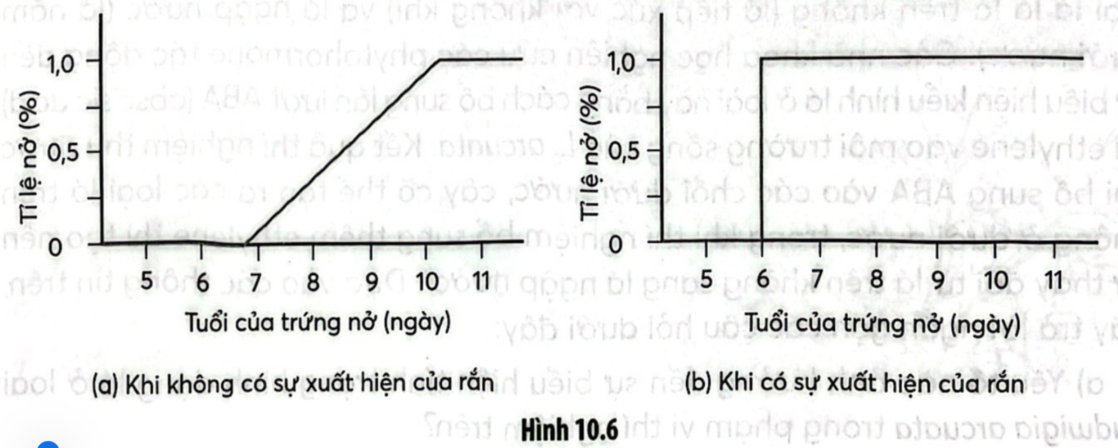 Câu 10.13: Ếch cây mắt đỏ (Agalychnis callidryas) sống ở vùng nhiệt đới Trung Mỹ, ếch cây mắt đỏ có đẻ trứng trên cây (trên lá) và khi nở nòng nọc rơi xuống vùng nước bên dưới. Karen Warkentin đã tiền hành thí nghiệm và nhận thấy rằng tỉ lệ nở và độ tuổi trứng nở của loài này khác nhau ở các ổ có sự xuất hiện của rắn mắt mèo (Leptodeira septentrionalis) hoặc không (Hình 10.6).