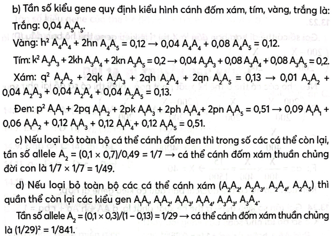 Câu 13.20: Một quần thể động vật giao phối, màu sắc đốm cánh do một gene gồm năm allele nằm trên nhiễm sắc thể thường quy định. Trong đó, allele A1 quy định cánh đốm đen trội hoàn toàn so với allele A2, A3, A4, A5, allele A2 quy định cánh đốm xám trội hoàn toàn so với allele A3, A4, A5, allele A3 quy định cánh đốm tím trội hoàn toàn so với allele A4, A5, allele A4 quy định cánh đốm vàng trội hoàn toàn so với allele A5 quy định cánh đốm trắng. Một quần thể đang ở trạng thái cân bằng di truyền có 51% con cánh đốm đen, 13% con cánh đốm xám, 20% con cánh đốm tím, 12% con cánh đốm vàng, 4% con cánh đốm trắng. Biết không xảy ra đột biến. Hãy xác định: