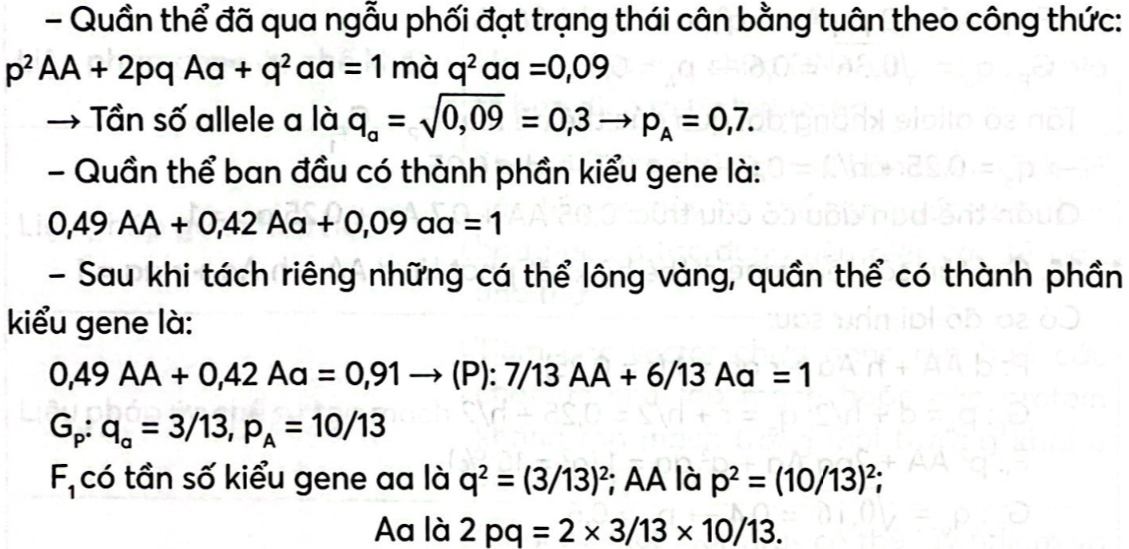 Câu 13.21: Ở một loài vật nuôi, màu lông do một gene có hai allele nằm trên nhiễm sắc thể thường quy định; A quy định lông xám trội hoàn toàn so với a quy định lông vàng. Quần thể đã qua ngẫu phối có 9% số cá thể lông vàng. Nếu sau đó tách riêng các cá thể lông vàng và cho các cá thể lông xám giao phối, hãy xác định tần số allele và tần số kiểu gene của quần thể sau một lần ngẫu phối tiếp theo.