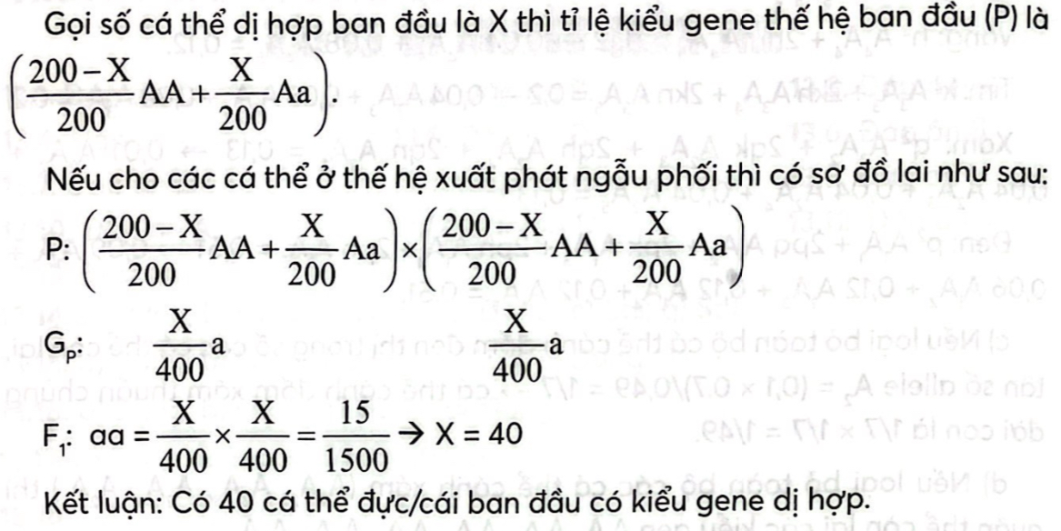 Câu 13.23: Một quần thể vật nuôi ngẫu phối, xét một gene có hai allele nằm trên nhiễm sắc thể thường có quan hệ trội lặn hoàn toàn. Trong đó tính trạng do gene lặn quy định là những tính trạng xấu nên những người chủ chăn nuôi thường xuyên phải loại bỏ chúng ra khỏi đàn. Khi cho giao phối ngẫu nhiên 200 cá thể đực, cái (tỉ lệ 1: 1) mang tính trạng trội, thu được đời con có 1500 cá thể con, trong đó có 15 cá thể mang tính trạng lặn. Giả sử không có đột biến mới xảy ra, hãy cho biết có bao nhiêu cá thể đực, cái thế hệ ban đầu đem lai có kiểu gene dị hợp.