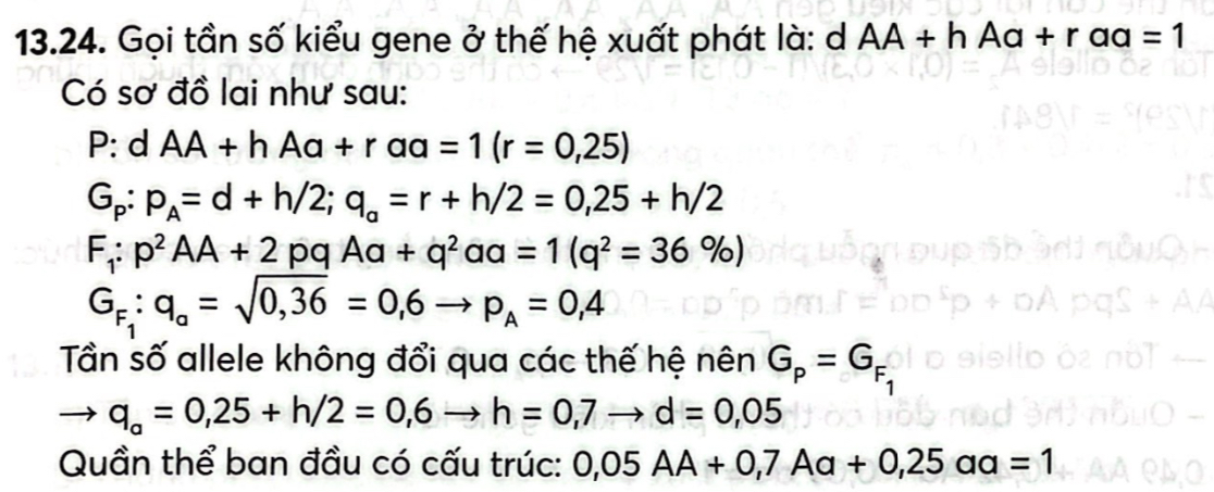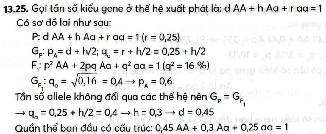 Câu 13.24: Một quần thể động vật ngẫu phối, không chịu tác động của các nhân tố tiến hóa. Xét một gene có hai allele trên nhiễm sắc thể thường có quan hệ trội lặn hoàn toàn. Thế hệ xuất phát (P) có tỉ lệ kiểu hình lặn chiếm 25 %. Khi quần thể ngẫu phối và đạt trạng thái cân bằng di truyền thì số cá thể có kiểu hình trội là 64%. Hãy xác định cấu trúc di truyền của quần thể ở thế hệ xuất phát (P).