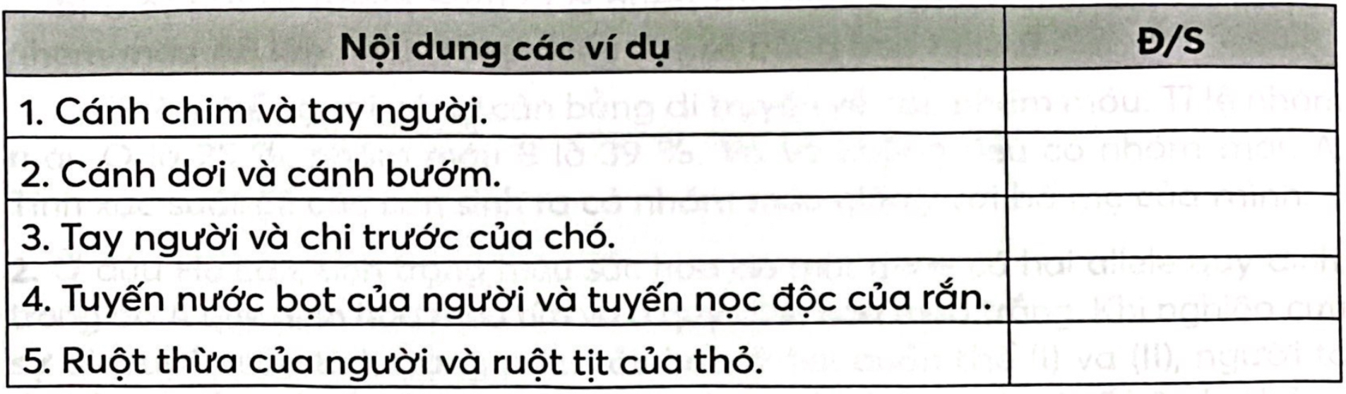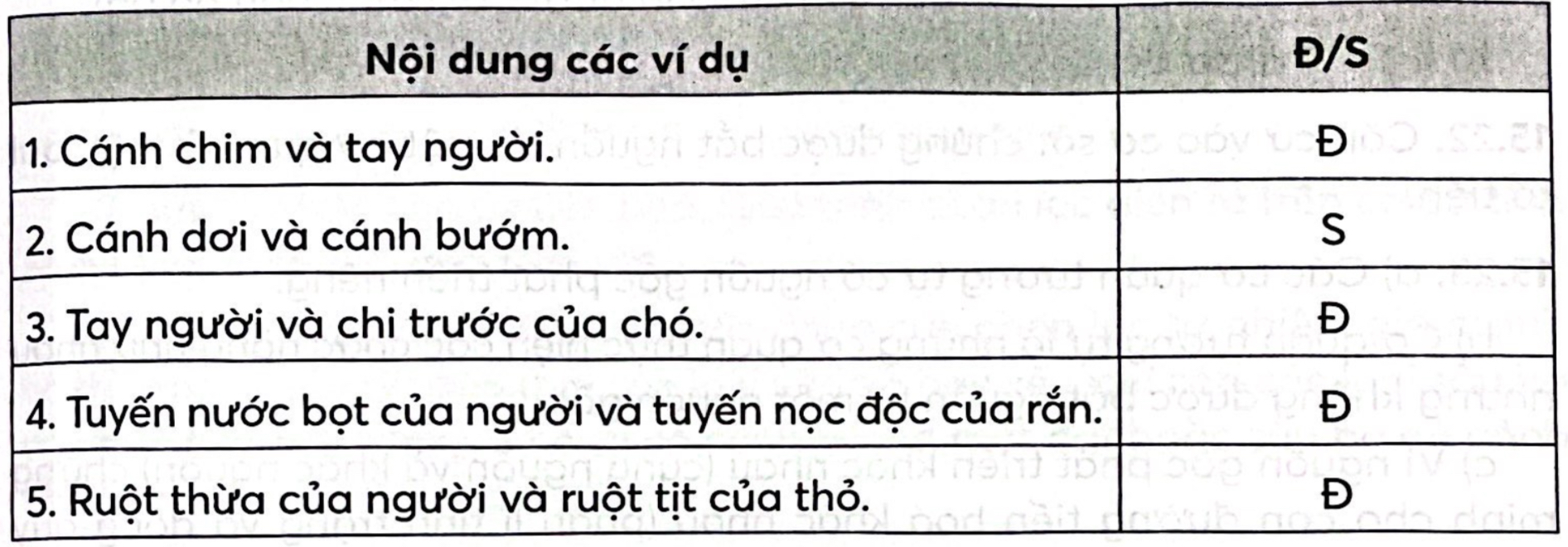 Câu 15.3: Những ví dụ sau đây là đúng hay sai khi nói về các cơ quan nằm ở vị trí tương ứng trên cơ thể sinh vật có cùng nguồn gốc trong quá trình phát triển phôi? Nếu đúng ghi Đ, sai ghi S vào cột tương ứng.