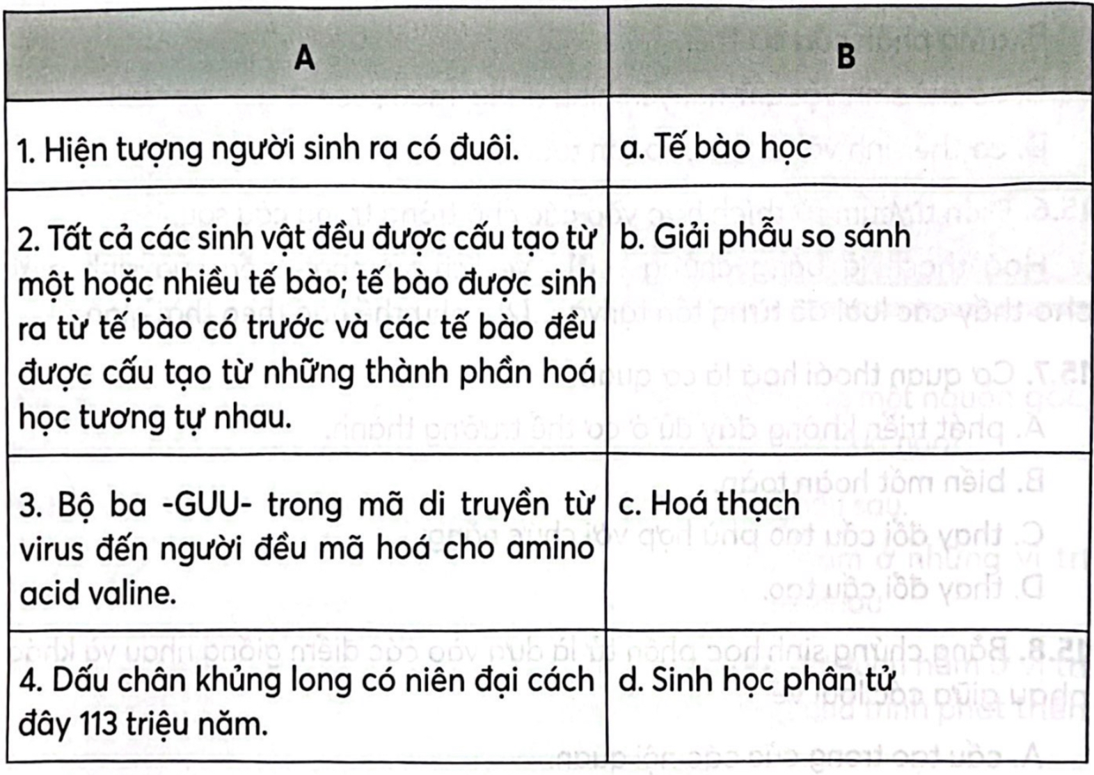 Câu 15.12: Nối mỗi dữ kiện ở cột A với loại bằng chứng tiến hóa ở cột B sao cho phù hợp.