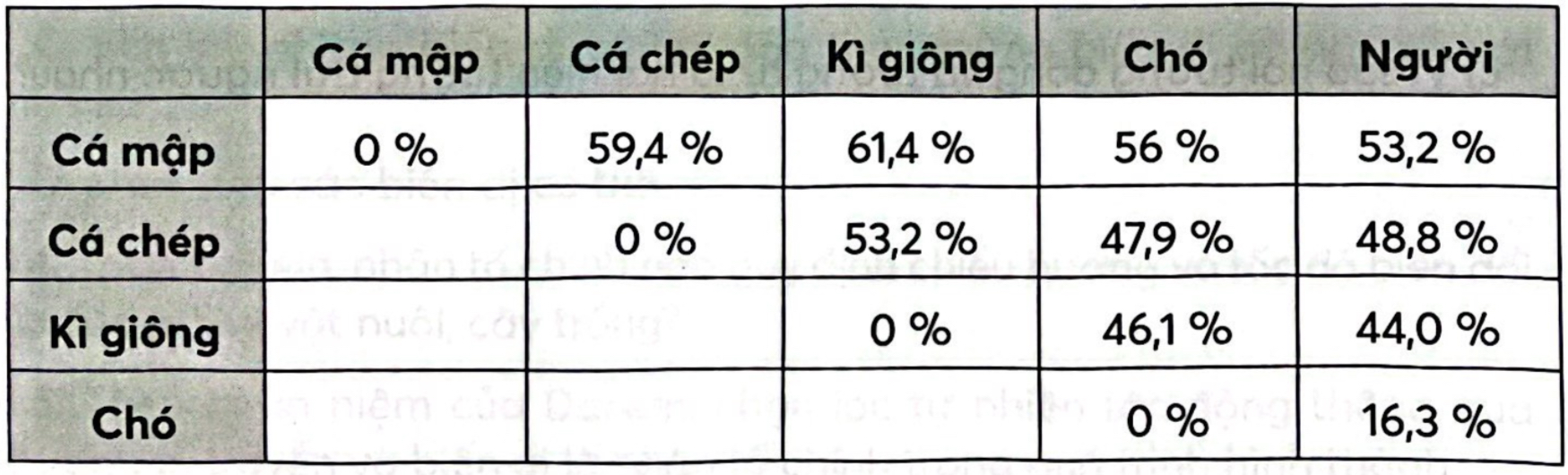 Câu 15.19: Phân tích tỉ lệ phần trăm các amino acid sai khác nhau trong chuỗi polypeptide a của phân tử Hb ở một số loài động vật có xương sống, người ta thu được kết quả như trong bảng dưới đây.