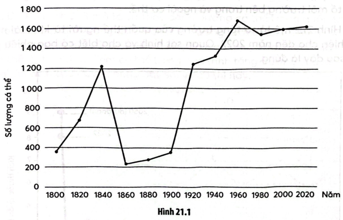 Câu 21.8: Đồ thị Hình 21.1 mô tả sự biến động số lượng cá thể trong quần thể của một loài sinh vật tại vùng đồng cỏ trong giai đoạn từ năm 1800 đến 2020. Cho biết kiểu biến động số lượng cá thể của quần thể này.