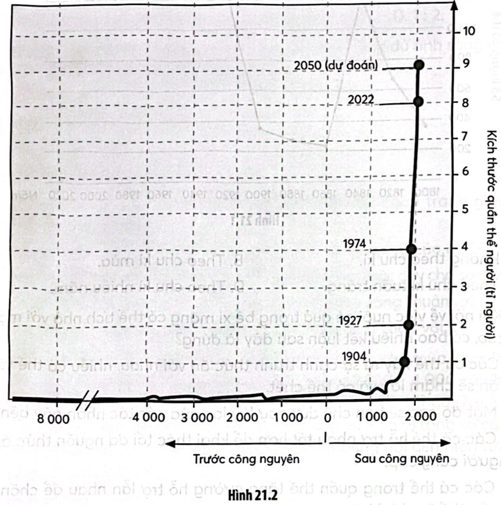 Câu 21.11: Hình 21.2 mô tả sự tăng trưởng của quần thể người từ khi loài người xuất hiện cho đến năm 2022. Quan sát hình và cho biết có bao nhiêu phát biểu sau đây là đúng.