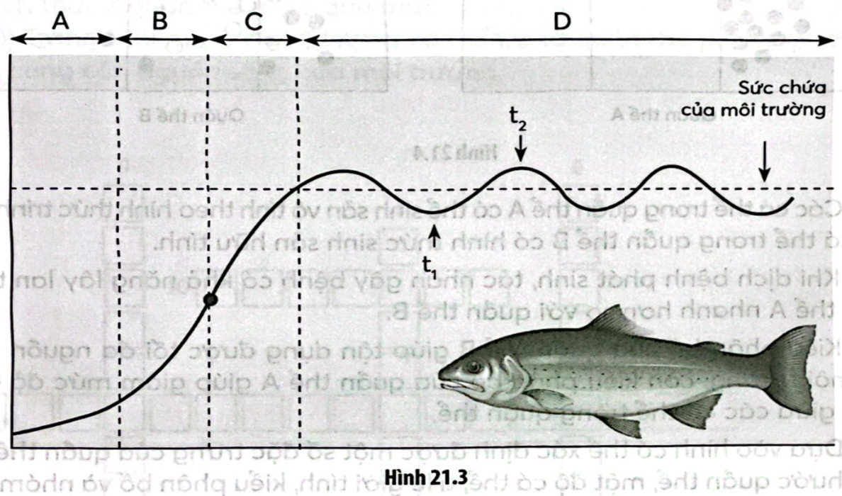 Câu 21.12: Đồ thị Hình 21.3 mô tả sự thay đổi số lượng cá thể trong quần thể của một loài cá giả định trong điều kiện môi trường tương đối ổn định theo thời gian. Trong đó, A, B, C, D biểu diễn các giai đoạn tăng trưởng của kích thước quần thể; t1, t2 là thời điểm cụ thể trong quá trình tăng trưởng của quần thể. Mỗi nhận định sau đây là đúng hay sai về đồ thị này?