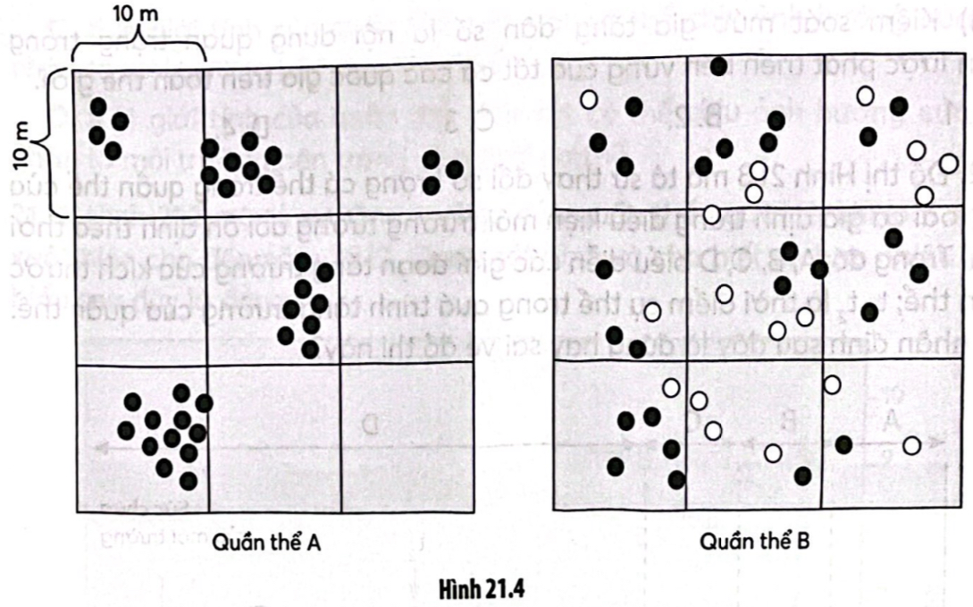 Câu 21.13: Hình 21.4 mô tả kiểu phân bố cá thể của hai quần thể A và B thuộc hai loài động vật giả định ở hai vùng có diện tích bằng nhau. Cho rằng các khu vực còn lại của hai quần thể nghiên cứu không có sự khác biệt so với mô tả trên hình và các dấu chấm (•) và (o) trong hình minh họa cho các cá thể có giới tính khác nhau. Mỗi nhận định sau đây là đúng hay sai về hai quần thể này?
