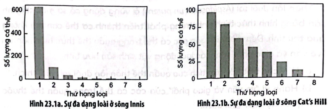 Câu 23.3: Đồ thị Hình 23.1a, 23.1b thể hiện sự đa dạng các loài cá ở sông Innis và sông Cat's Hil trên đảo Trinidad. Khi nói về chỉ số đa dạng và độ phong phú của hai quần xã này, phát biểu nào sau đây đúng?