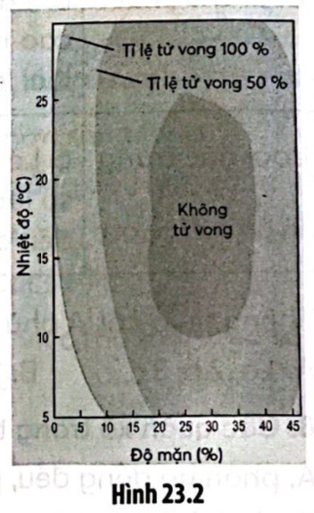 Câu 23.12: Hình 23.2 minh hoa ổ sinh thái của tôm biển Crangon septemspinosa sống dọc theo bờ biển Đại Tây Dương của Bắc Mỹ với hai nhân tố là nhiệt độ và độ mặn. Quan sát hình và cho biết có bao nhiêu phát biểu sau đây đúng?
