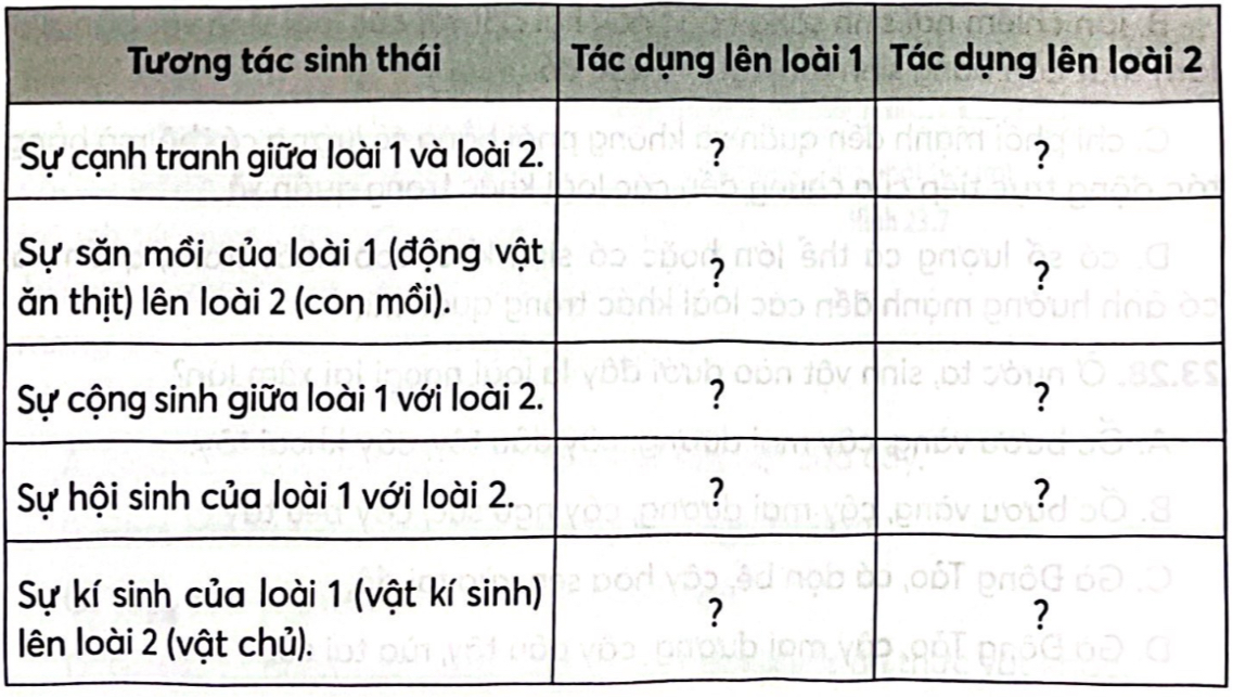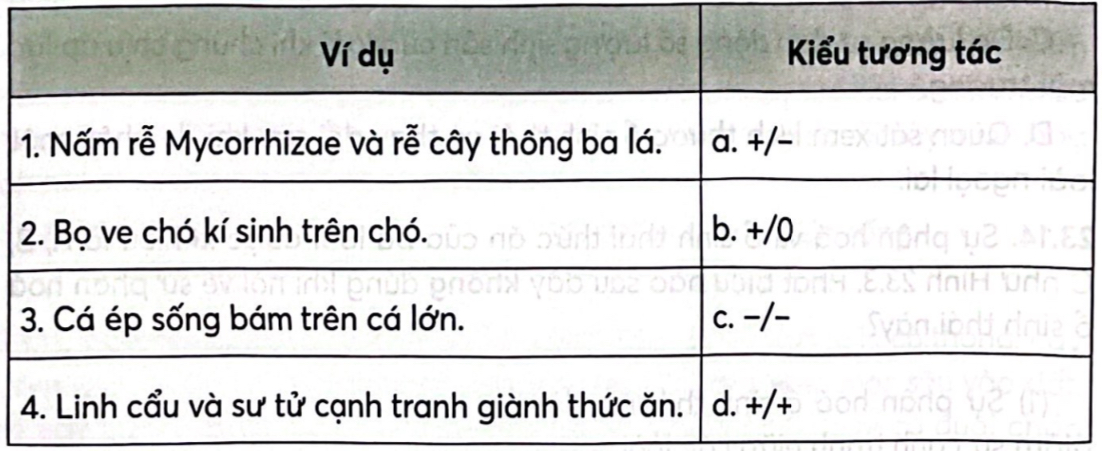 Câu 23.31 a) Dựa vào bảng tương tác sinh thái giữa các loài dưới đây, hãy xác định các tương tác đó có lợi, có hại hay không có lợi, không có hại lên từng sinh vật.